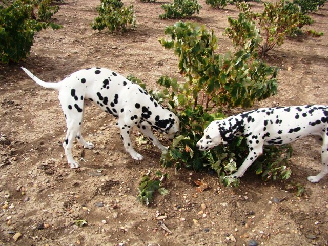 Como muchos sabéis, nosotros y nuestros dálmatas vivimos rodeados de viñedos, rodeados de un «mar verde de viñas», en pleno corazón de la comarca Tierra de Barros, donde la denominación de origen vitícola Ribera del Guadiana produce la mayoría de sus apreciados y «famosos caldos».