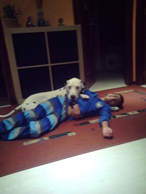 Una noche que andaba suplicándole a pleno pulmón que ya era hora de ir a la cama, apareció Cooper, se acercó a mi hijo y comenzó a empujarle como vaca que topa, hasta que le metió en su habitación. Edgar y yo nos empezamos a reír porque después de hacer esto, Cooper se sentó y me miraba como diciendo “¡alaaa, ya está, trabajo hecho!” 🙂