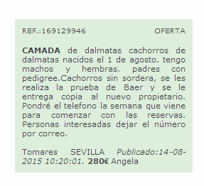 La primera noticia estaba relacionada directamente con nuestros dálmatas y en ella una amiga y criadora nos alertaba del uso que cierta persona estaba haciendo en un portal de internet dedicado a la compra-venta, donde anunciaba una camada usando diferentes fotografías de una de nuestras dálmatas y de sus cachorros y que seguramente había cogido de manera ilegal de nuestro blog antiguo.